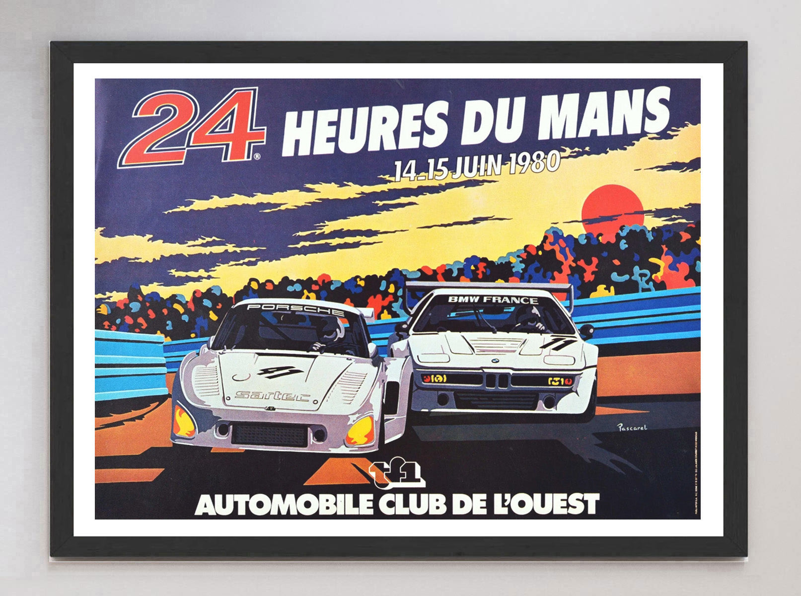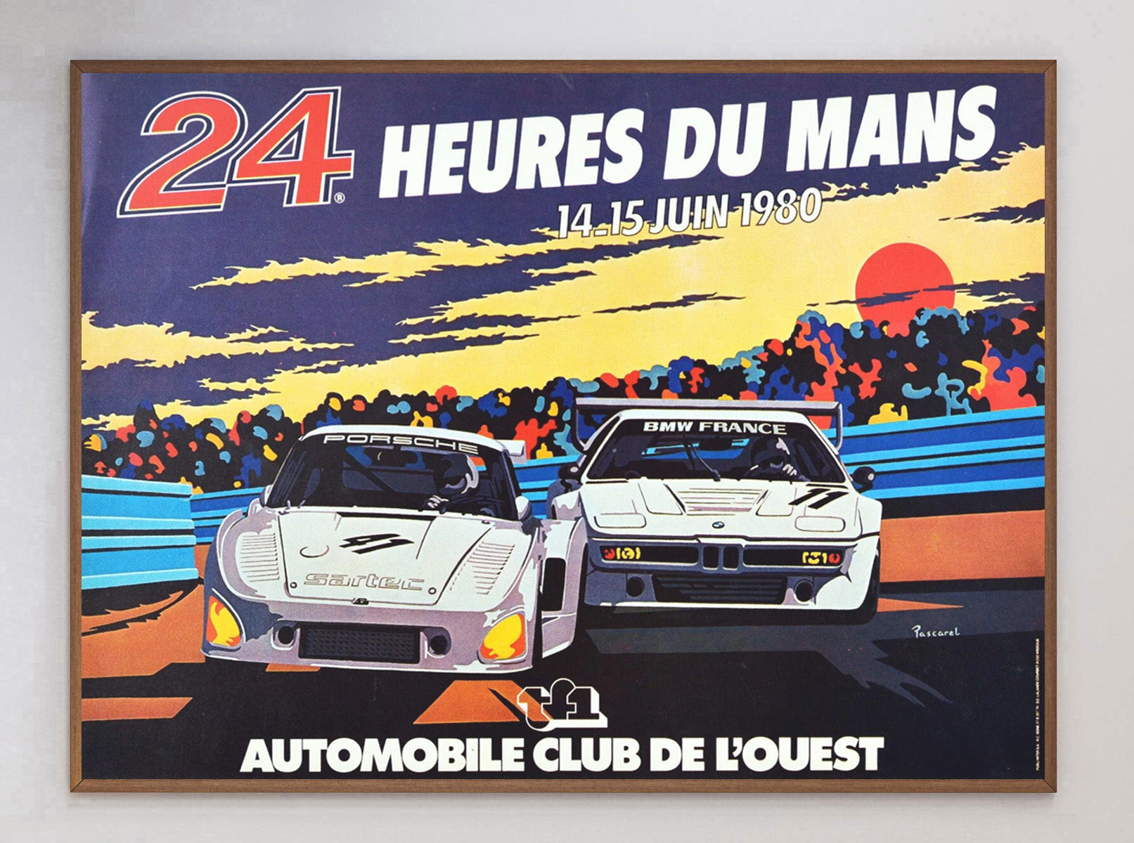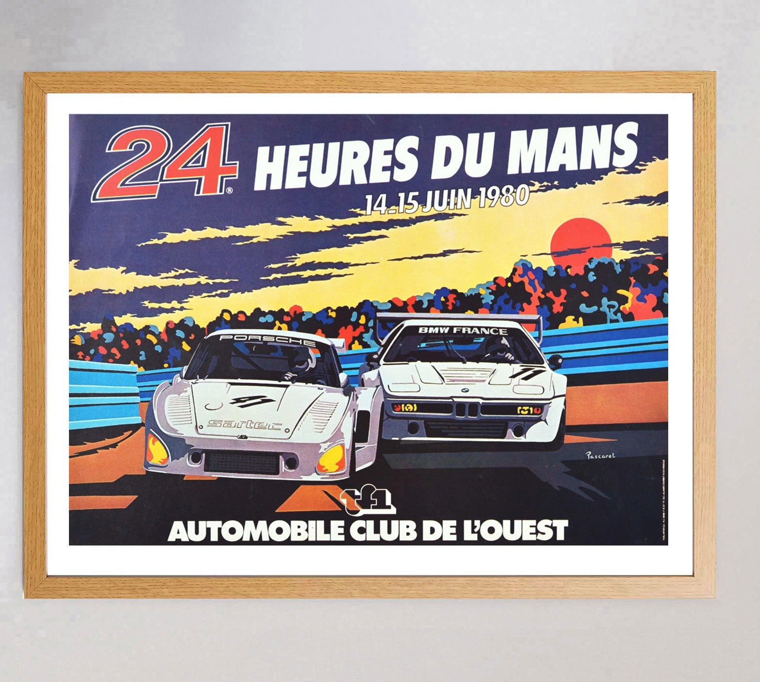 This poster is for the 1980 Le Mans 24 Hours, with the brilliant illustration design by Lardrot depicting a Porsche 935 and BMW M1 racing.