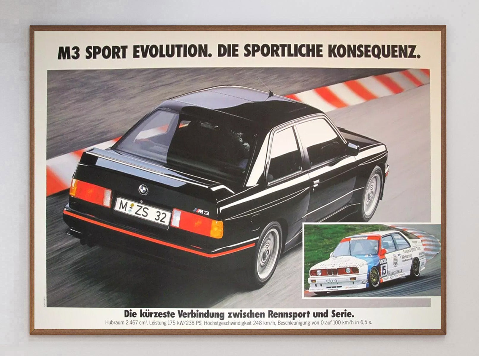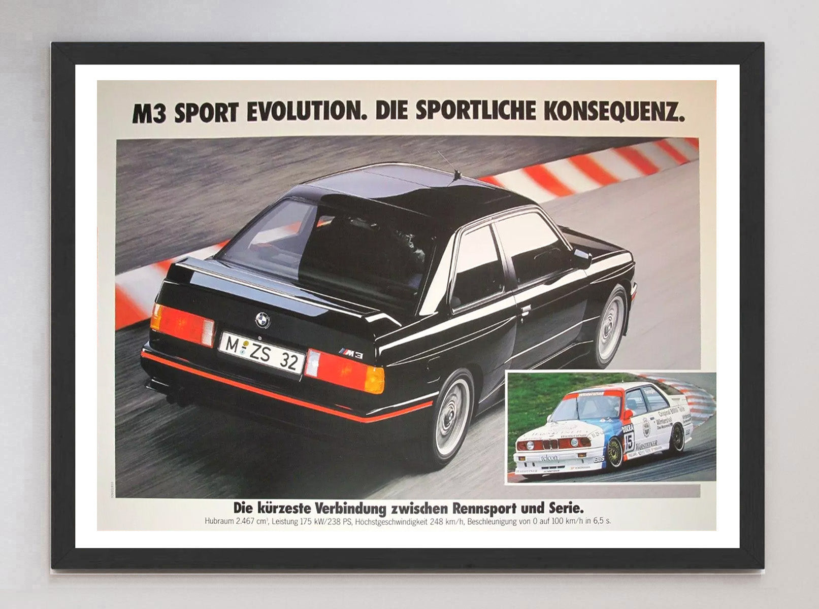 Reading "BMW M3 Sport Evolution, Duie Sportliche Konsequenz" or "The Sporting Consequence" this brilliant poster celebrates the iconic BMW M3 Sporting Evolution model. First introduced as the E30 model in 1986, the M3 model has been one of the most successful for the brand and a new iteration has been released with each generation to date.