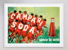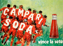 This beautiful poster is an extremely rare design reading "Vince la sete" or "Thirst wins" and depicts a football team reading "Campari Soda" between the letters on each players back. This stunning poster is in excellent condition and is extra large in size. The poster has been backed on museum quality linen to ensure its preservation for the decades to come.