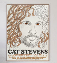 Wonderfully illustrated poster for Cat Stevens' 1974 concert at the Waikiki Shell in Honolulu, Hawaii. The popular British folk artist, now known as Yusuf, performed songs from his hugely successful albums of the earlier 1970s and 1960s including number one album "Catch Bull at Four" and "Teaser and the Firecat" on the tour.