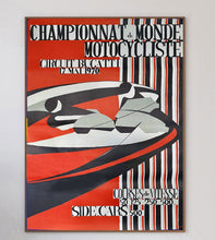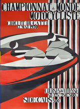 Beautifully designed poster for the Championnat de Monde Motocycliste Circuit Bugatti, or Bugatti Circuit Motorcycle World Championship in 1970. The Bugatti Circuit is a part of the Circuit de la Sarthe - Le Mans 24 Hours. Giacomo Agostini won the race for MV Agusta.