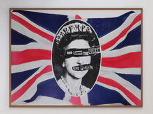 One of the greatest songs from one of the most influential bands of the past century, this iconic poster with artwork from Jamie Reid was released during Queen Elizabeth II's silver jubilee. This extremely rare piece of music history is in fantastic and unaltered condition.