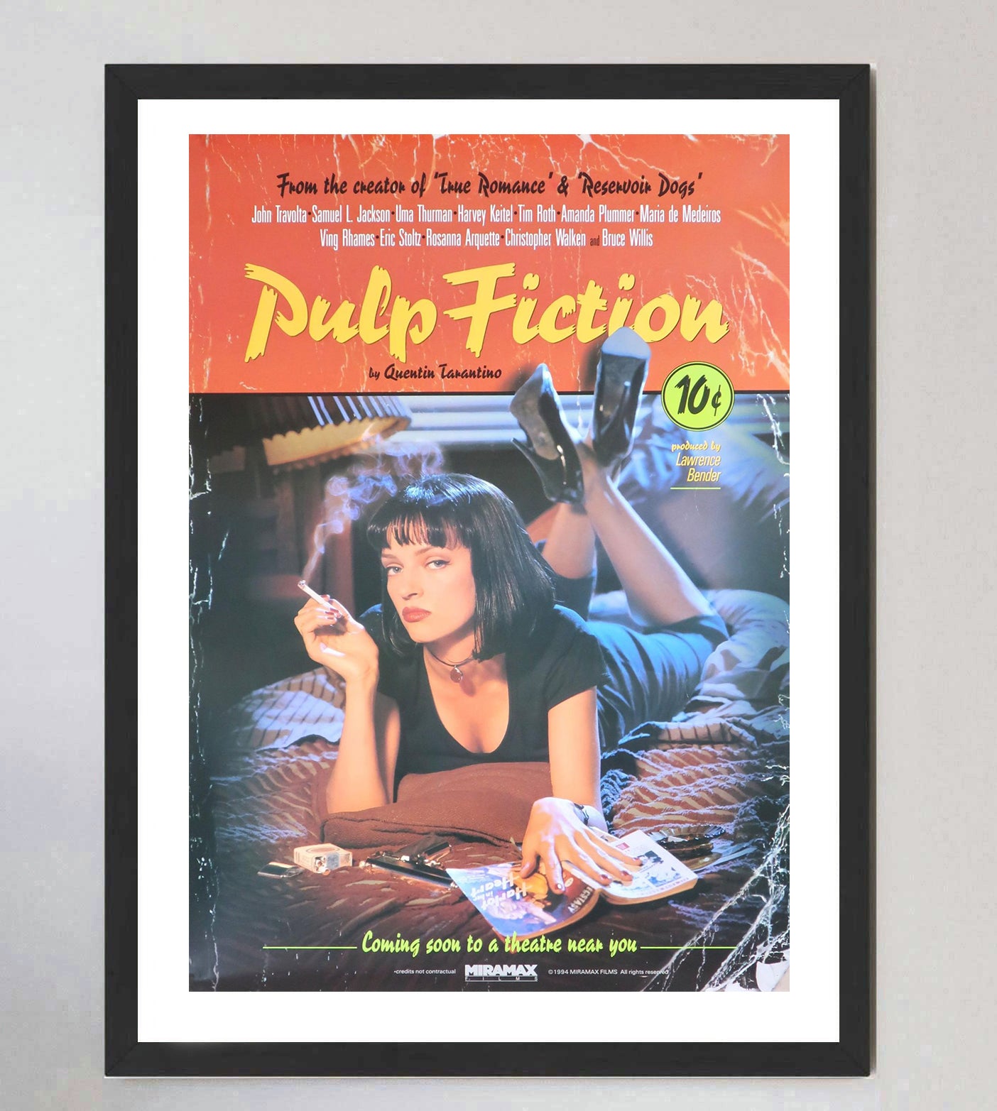 This stunning and extremely rare advance US One-Sheet poster is the "Lucky Strike" version that was quickly recalled due to lack of clearance from the tobacco company to copy their design. Designed by James Verdesoto, depicting Uma Thurman laying on a bed smoking, this is one of the rarest pieces from the 1990s and is in great condition with some fading to colour.