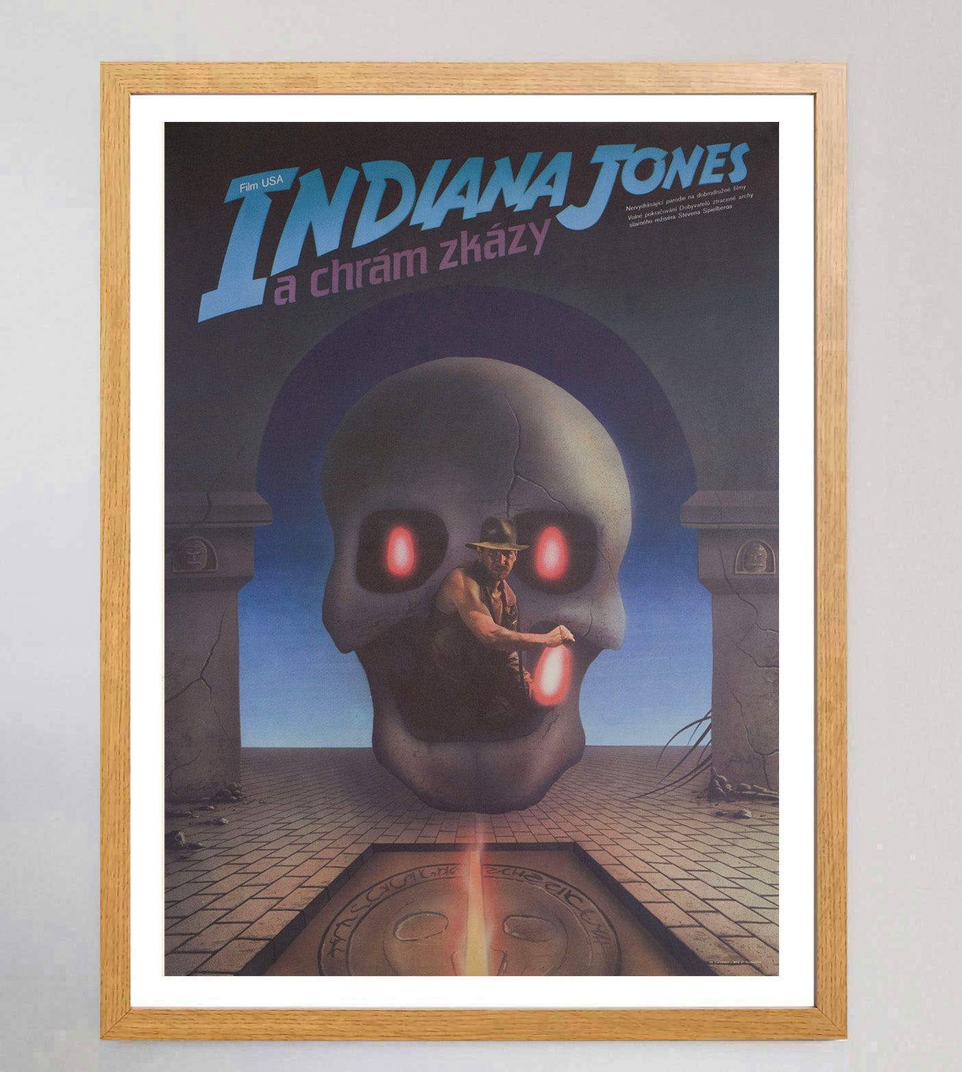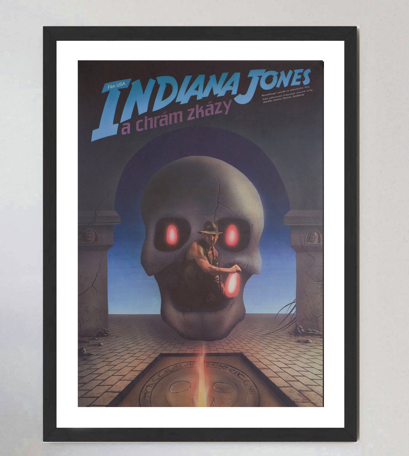 A beautifully designed poster for the 1984 Steven Spielberg film "Indiana Jones and the Temple of Doom". The sequel to smash hit "Raiders of the Lost Ark", the Harrison Ford starring smash won the Academy Award for Best Visual Effects and spawned the Sean Connery starring sequel "The Last Crusade".