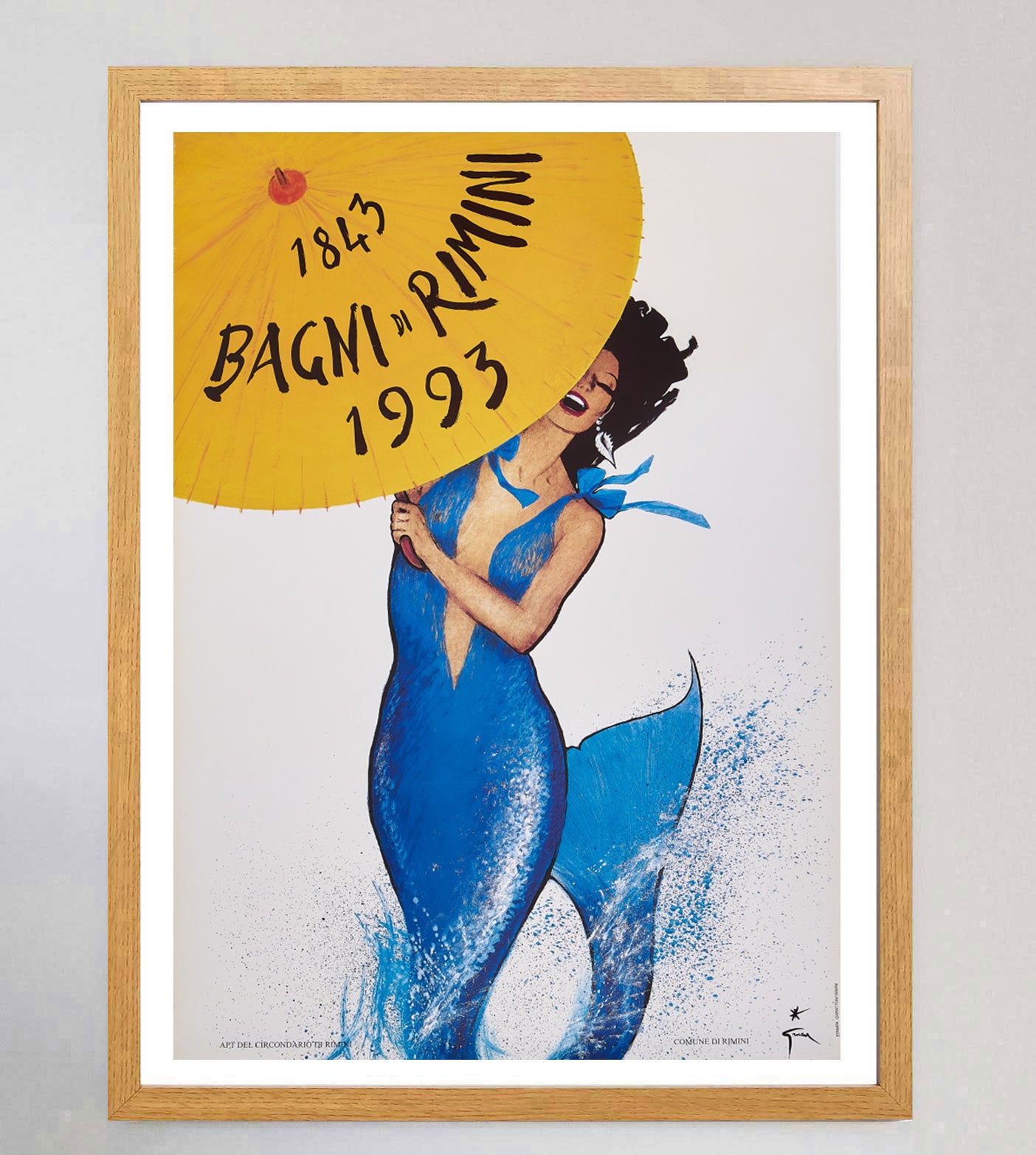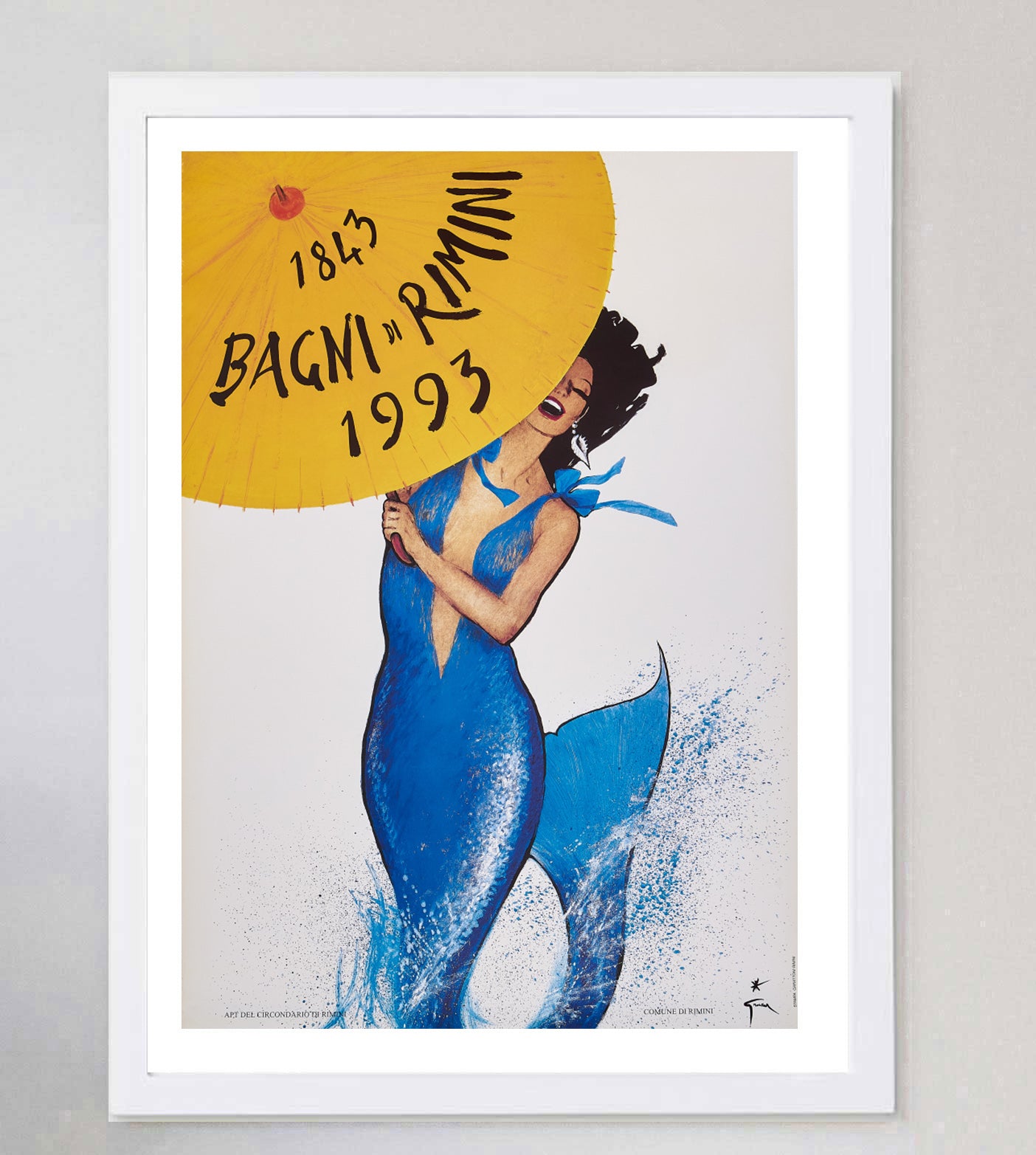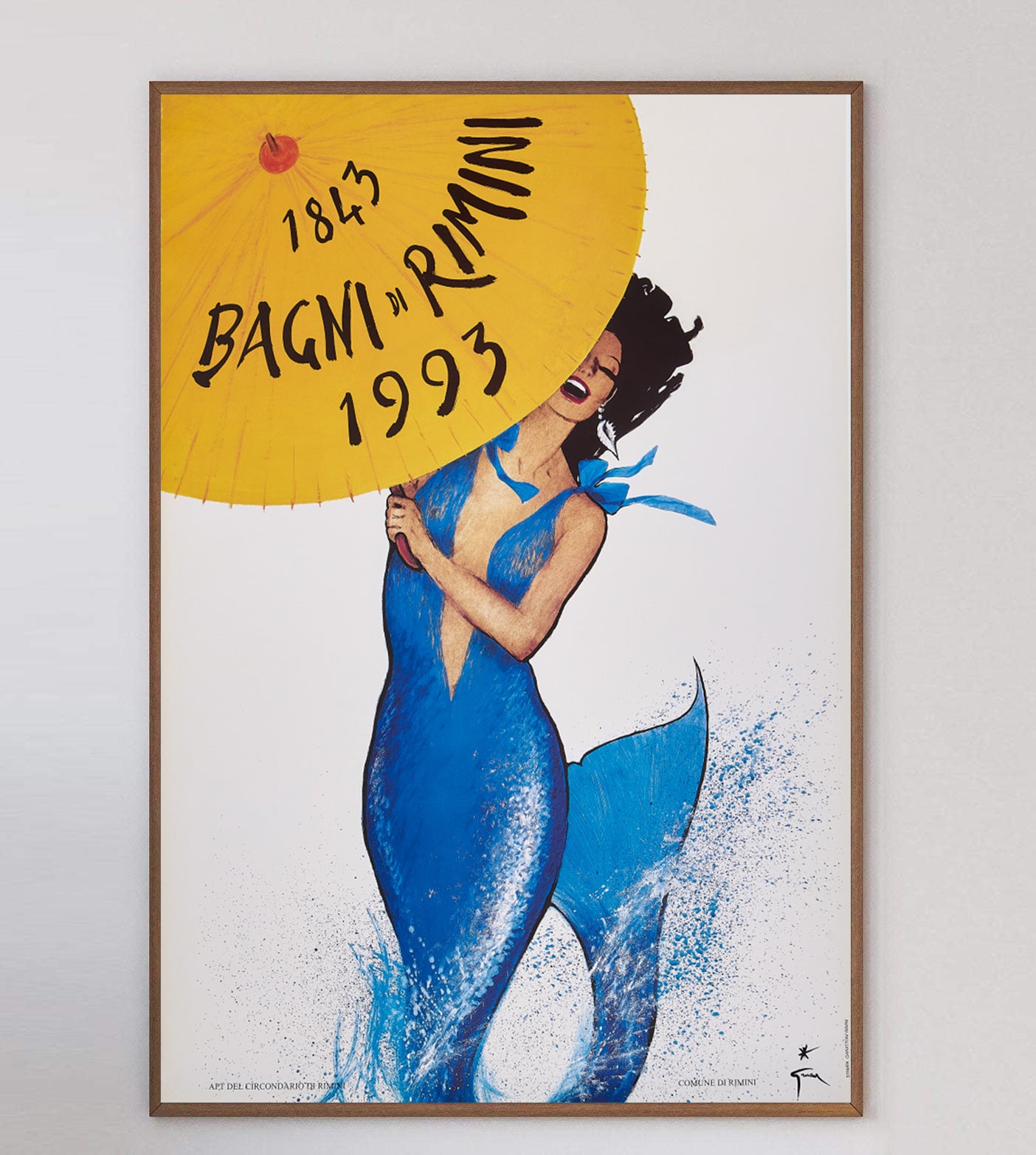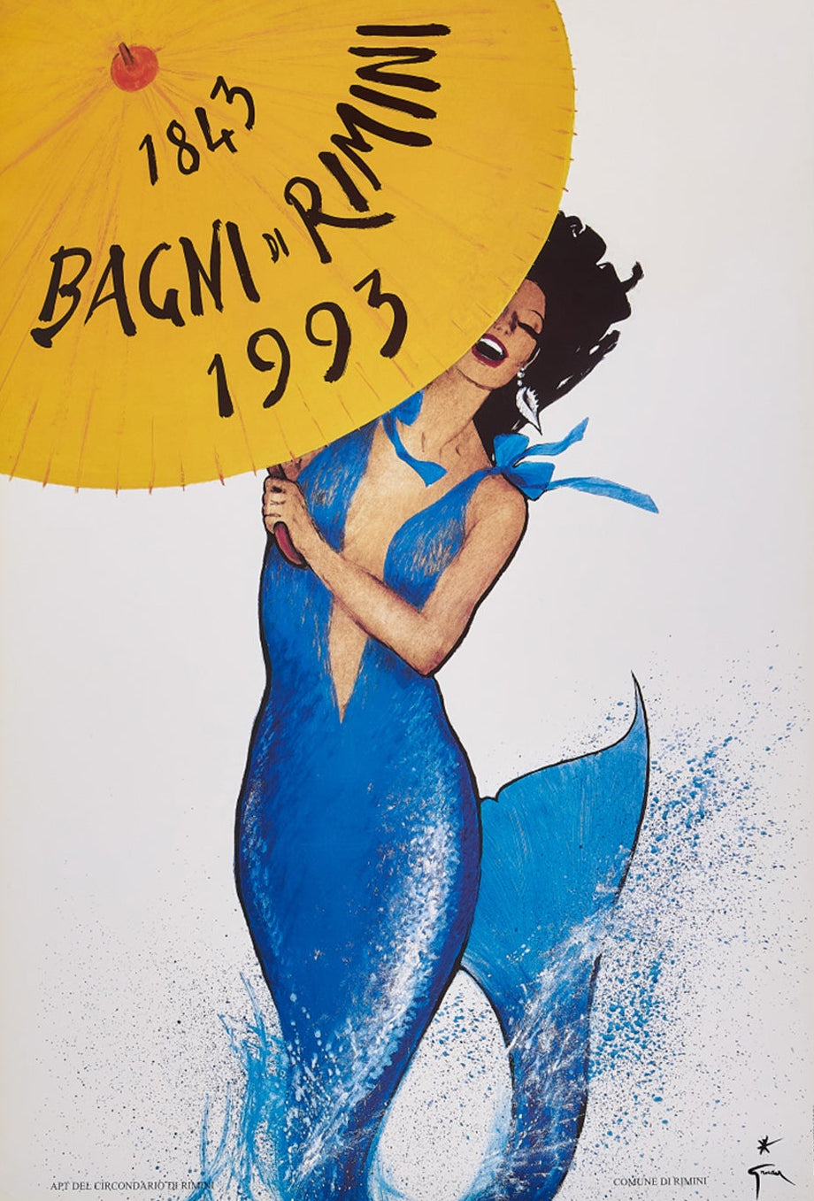 Designed by the iconic poster artist Rene Gruau, this poster was created in 1993 to promote the Italian city of Rimini and its Baths, reading "Bagni di Rimini". The beautiful seaside resort city in northern Italy is ever popular with tourists and this wonderful design shows why. The poster was created in 1993 to celebrate the 150th anniversary of the founding of the baths.