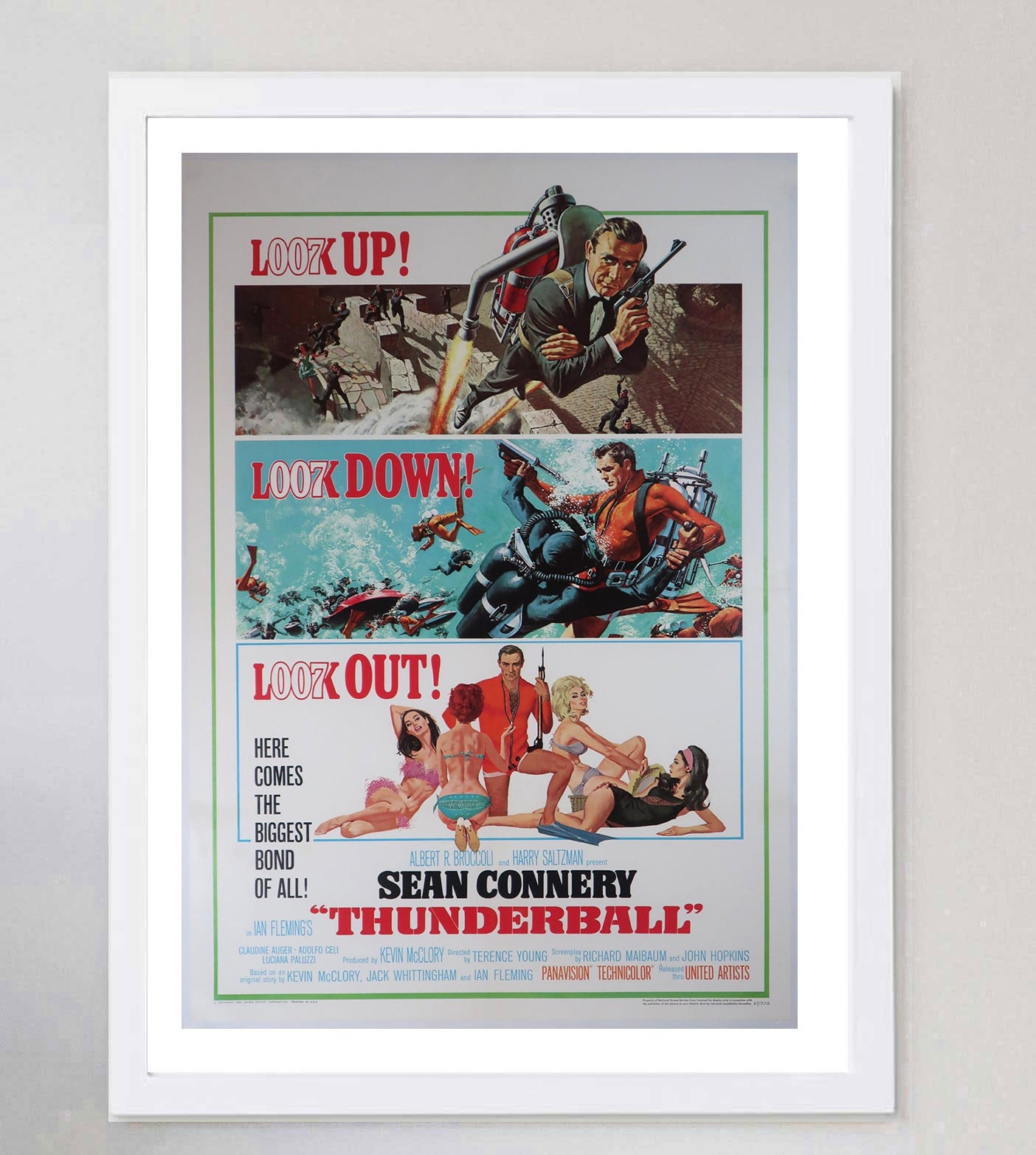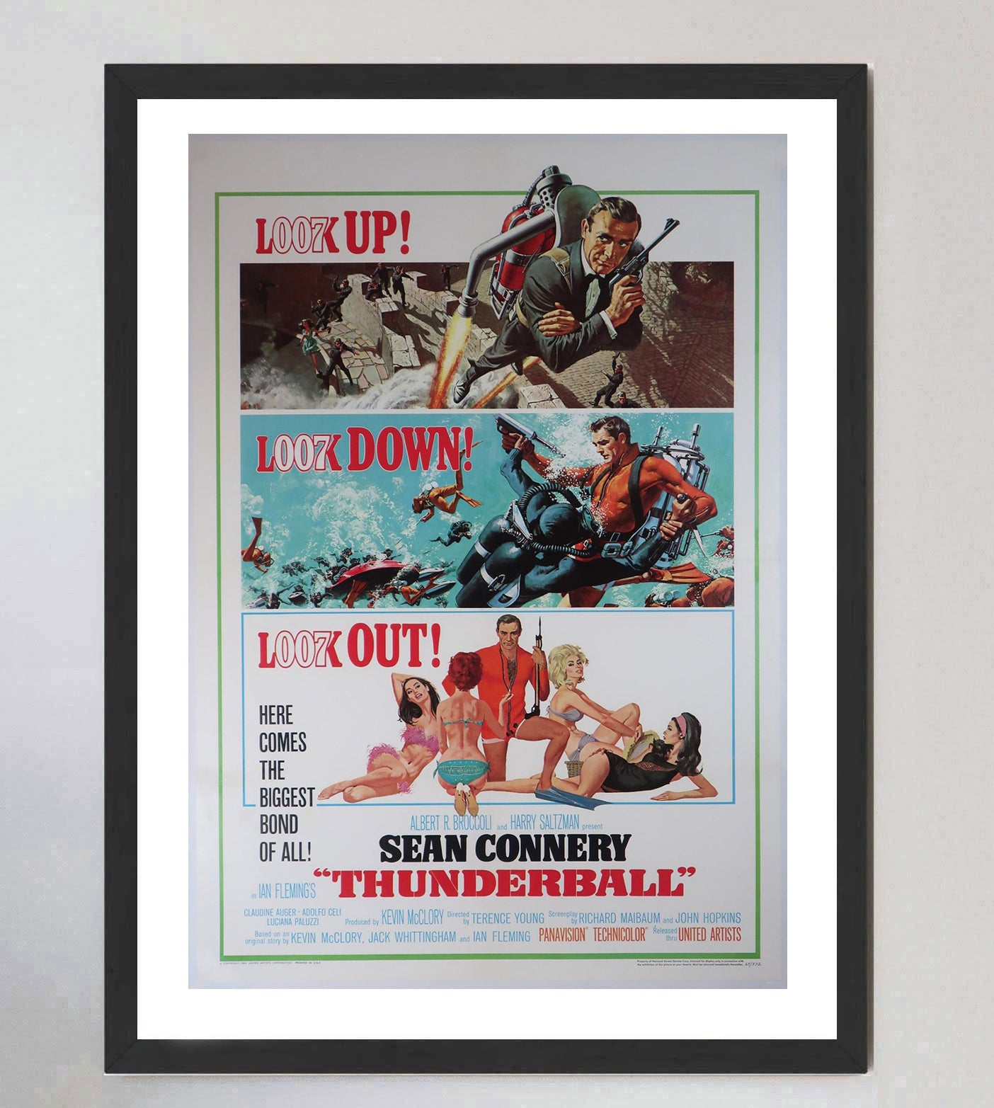 This incredible US One-Sheet poster is from the original release of the film in 1965 and features fantastic artwork from the legendary Robert McGinnis of Connery's Bond involved in 3 very different situations, the top (and usually cut from other versions of the design) he is flying high on a jetpack, the second, he is in close combat underwater, and the third, he is of course relaxing with several companions. The rare piece is in fantastic mint condition and backed on linen to ensure its preservation for the decades to come.