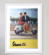 This beautiful & bright poster was created in 1960, printed in Italy to promote the iconic Vespa GS. The first Vespa was manufactured in 1946, and they are still as sought after today as ever. The photograph the poster depicts young American actor Ted Windsor and a female companion at the Foro Italico in Rome.