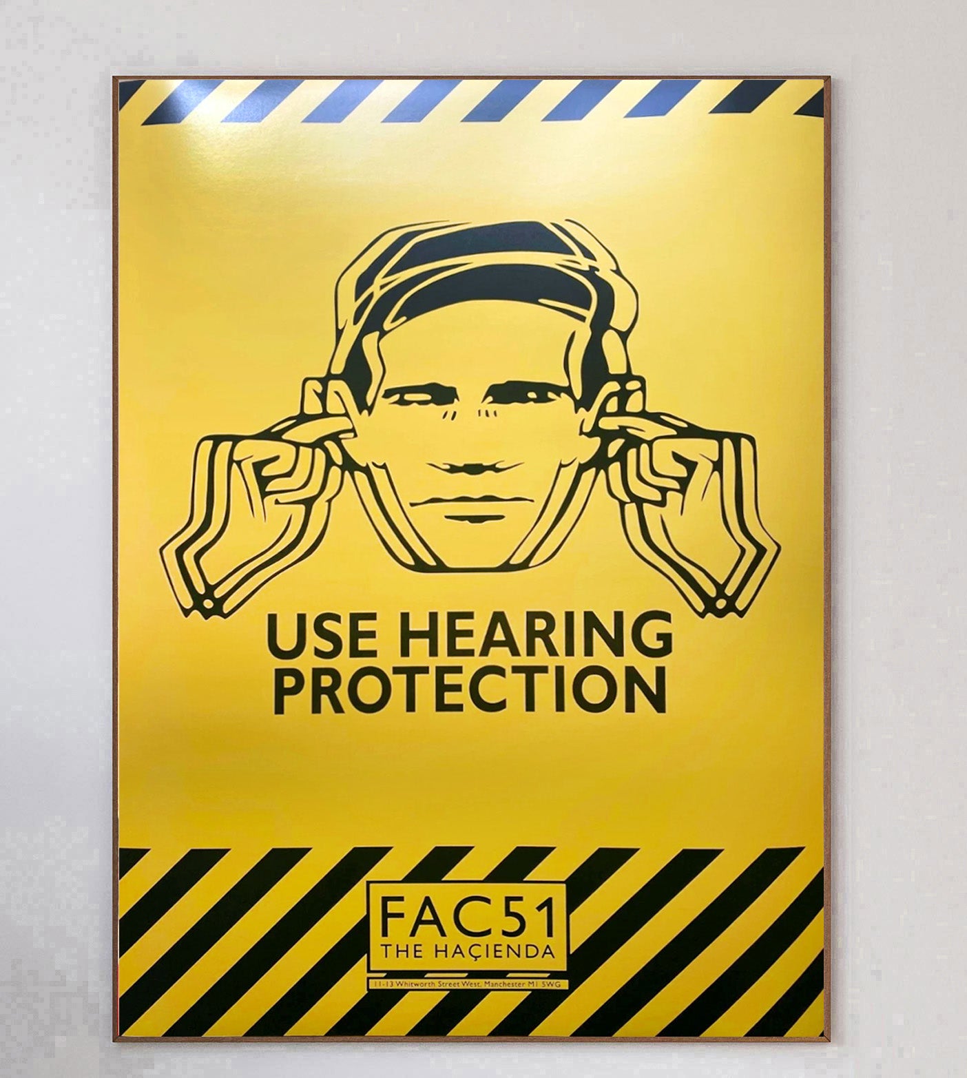 Brilliant poster "Use Hearing Protection" printed for display in FAC 51 The Hacienda, featuring iconic imagery from Peter Saville. This blue-backed poster was never displayed and is in mint condition.