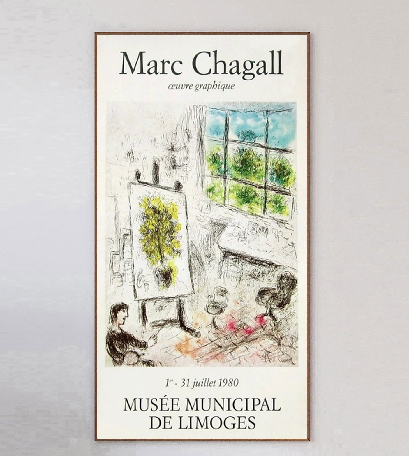 Featuring a 1975 etching "Celui qui dit les choses sans rien dire" or "He who says things without saying anything", this wonderful poster was created to promote the 1980 exhibition of Chagall's graphic works at the Musee Municipal de Limoges in France.
