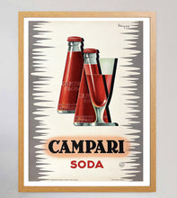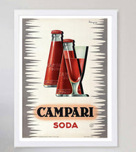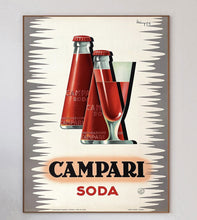 Stunning poster designed by Italian artist Giovanni Mingozzi for Campari Soda, created in 1950. This gorgeous and vibrant piece depicts the Campari Soda bottle designed by Futurist artist Fortunato Depero.