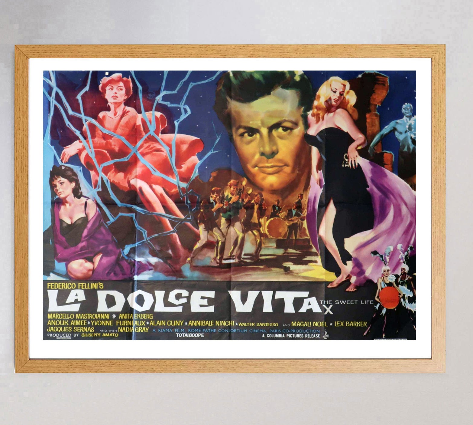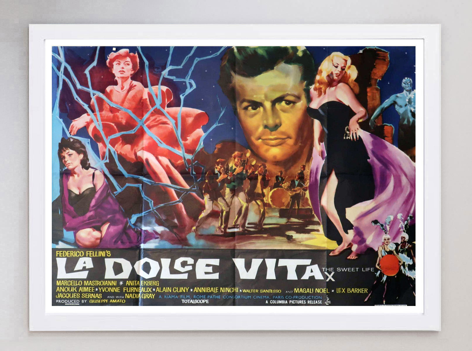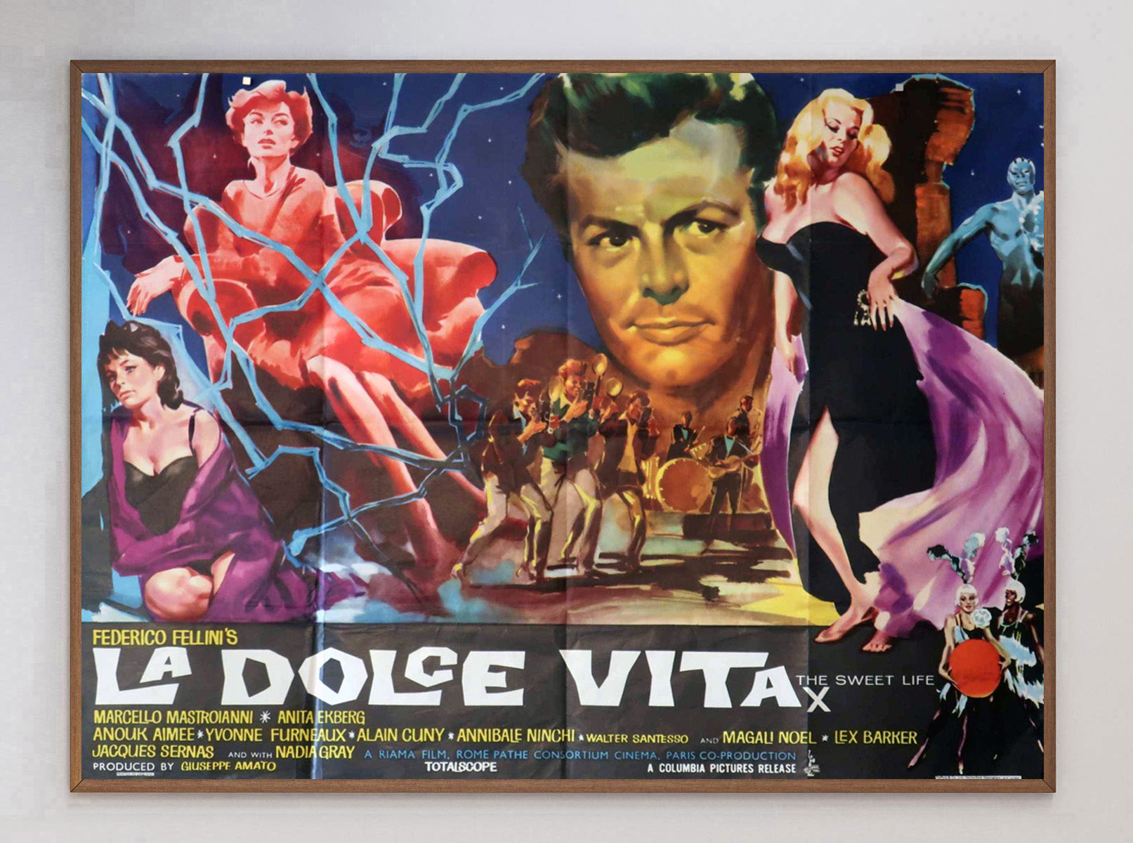 This UK quad poster is one of the most desirable designs for the film and its not hard to see why, with the vibrant artwork featuring many of the characters from throughout the story including a dancing Anita Ekberg. This piece is in fantastic unrestored condition with unfaded colour.