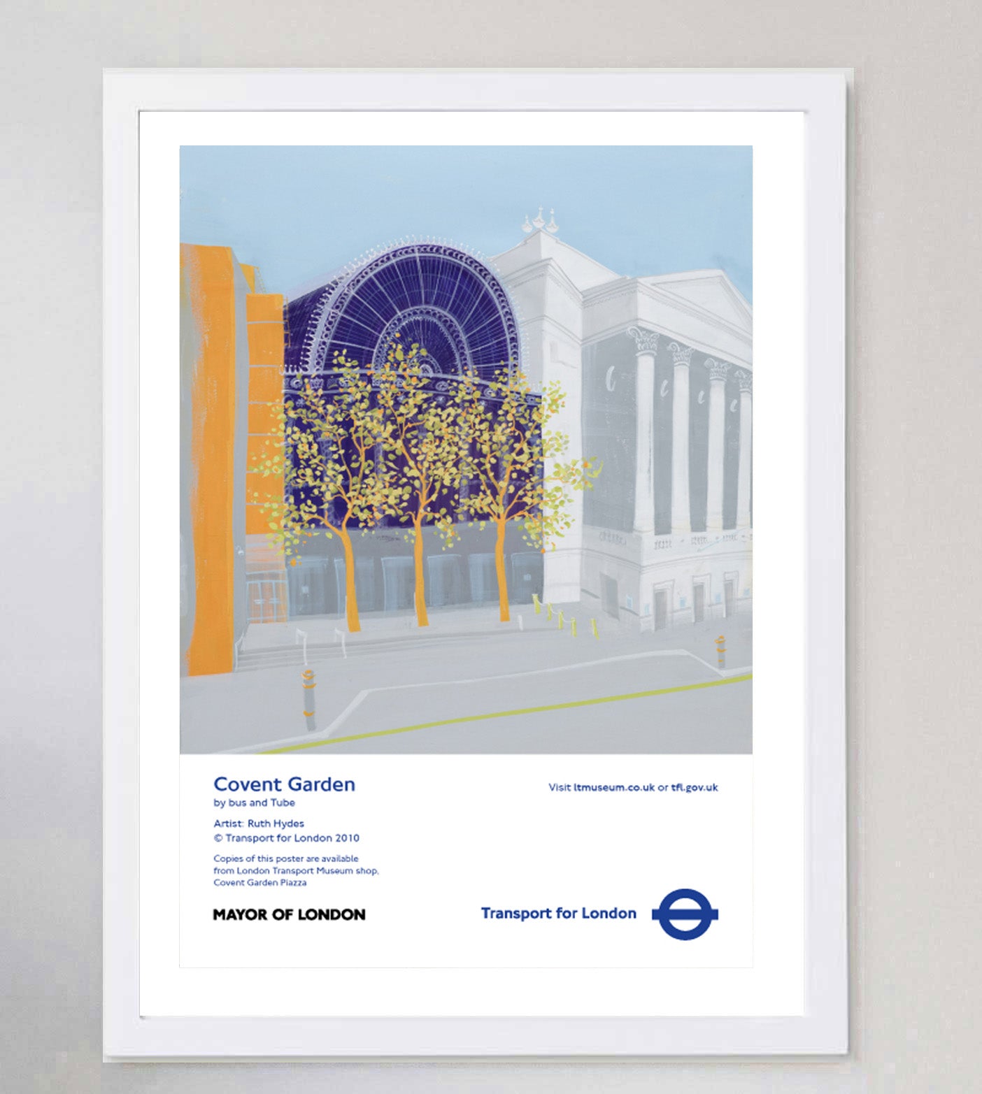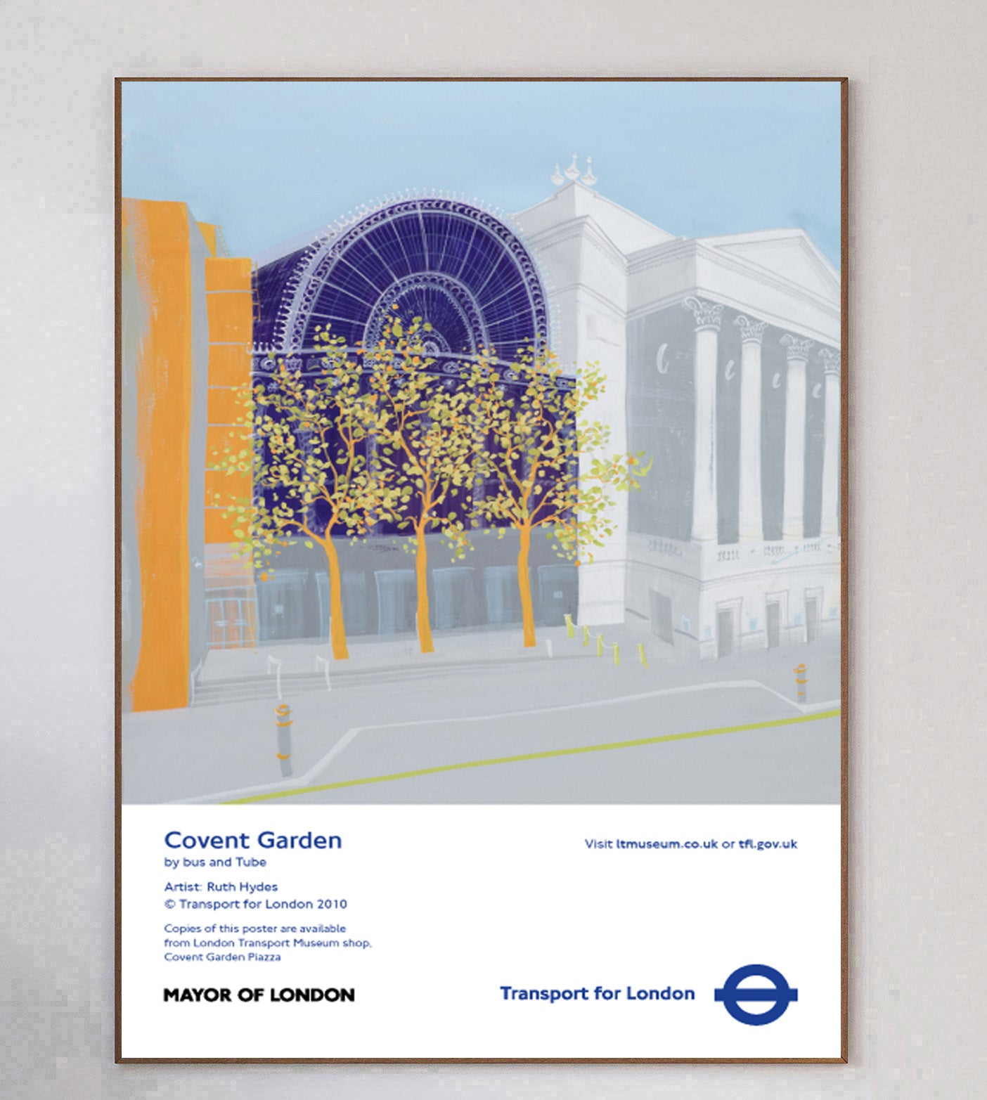 Gorgeous poster featuring artwork by British artist Ruth Hydes for "Covent Garden by Bus and Tube" depicting some of the beautiful buildings in central London's iconic Covent Garden.