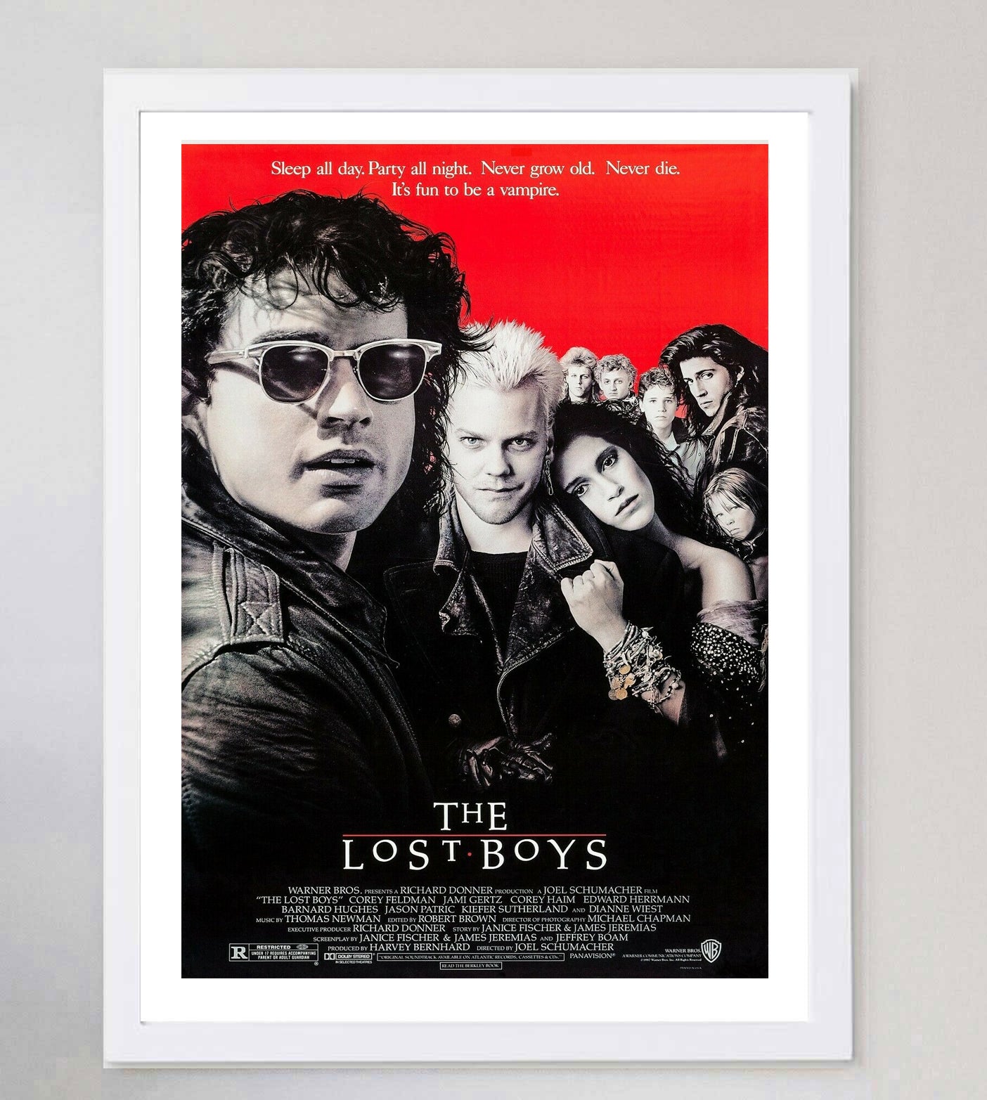 This US One-Sheet poster is from the original theatrical release of the film in 1987 and features the iconic caption "Sleep all day. Part all night. Never grow old. Never die. It's fun to be a vampire".