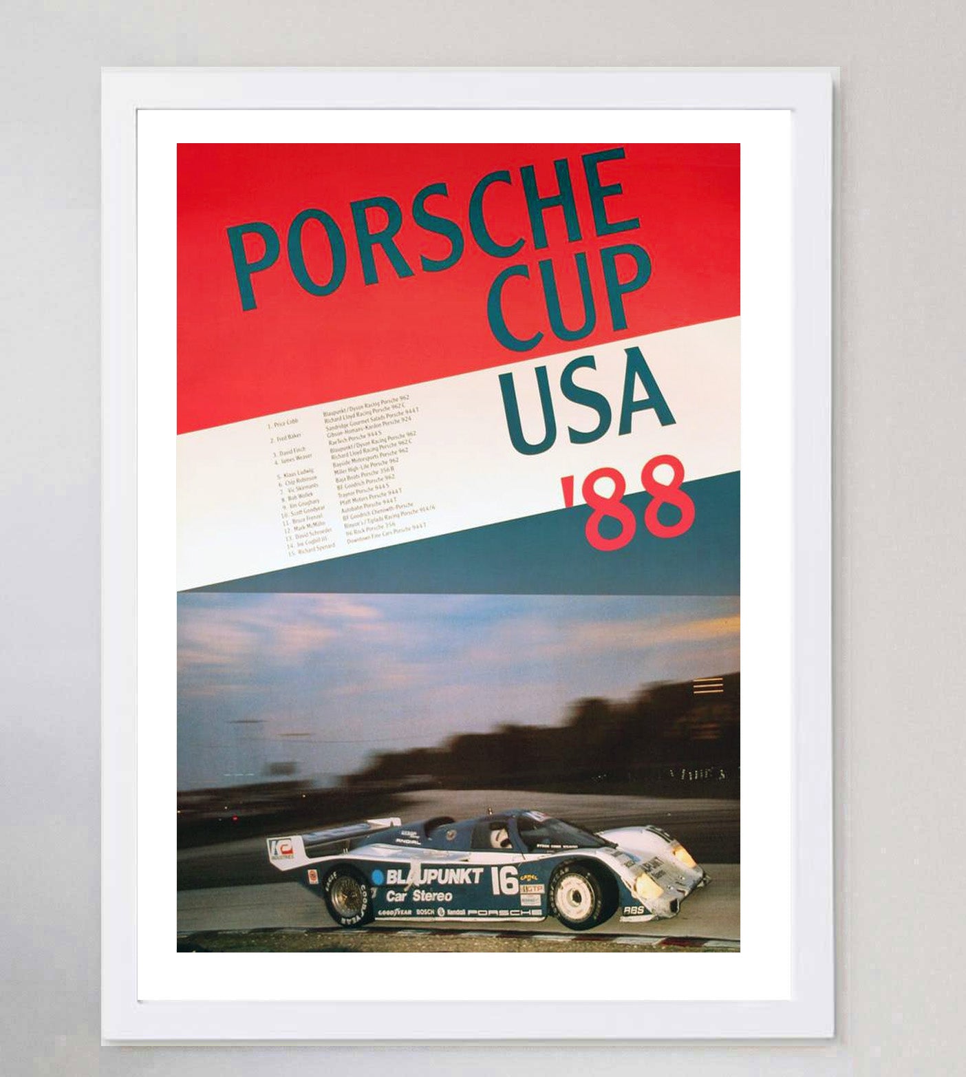 Gorgeous original Porsche Cup USA 1988 poster featuring the iconic Blaupunkt Porsche 962 speeding past the camera. A dynamic design showcasing Porsche’s racing heritage, with bold typography and graphics listing the season’s top drivers.