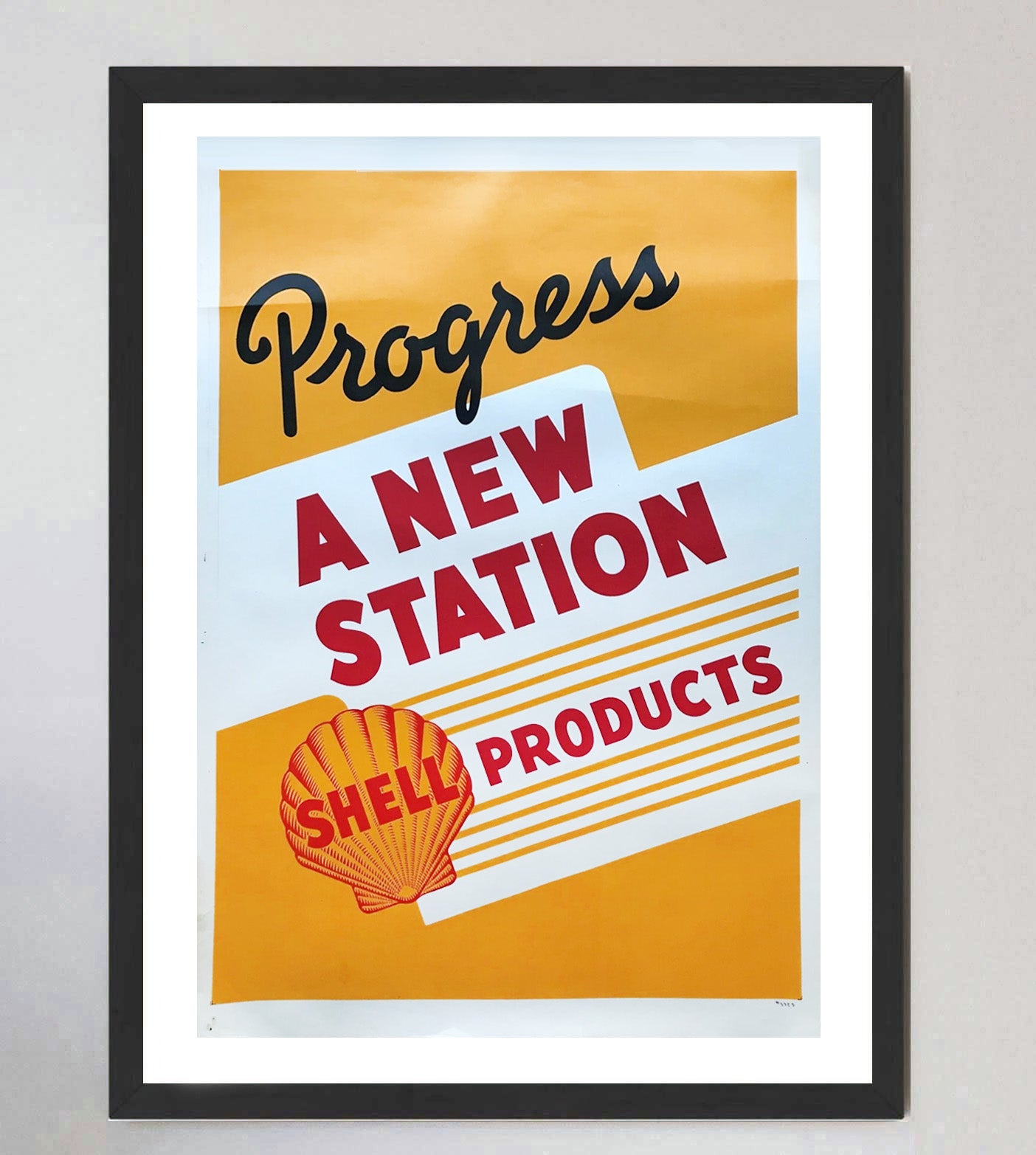 A vibrant example of mid-century commercial design, this original Shell Oil poster from 1960 captures the optimism and innovation of the postwar era. Featuring bold type and bold colour layout, the piece celebrates the "Progress" of the brands expansion expansion and modernisation of its service stations.