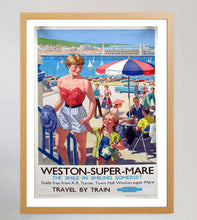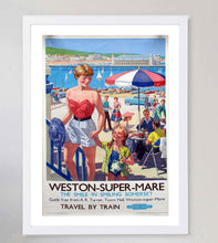 This stunning and rare poster for British Railways was created in 1960 to promote their routes to Weston-Super-Mare in Somerset, England. With artwork by Harry Arthur Riley (1895-1966) depicting a happy mother and daughter walking up from the Weston seafront on a beautiful summers day, this never folded piece is a great throwback to the mid-century British holiday.